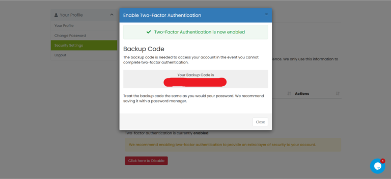 Step 5: Record the Backup Code somewhere safe in case you lose access to your 2FA device
